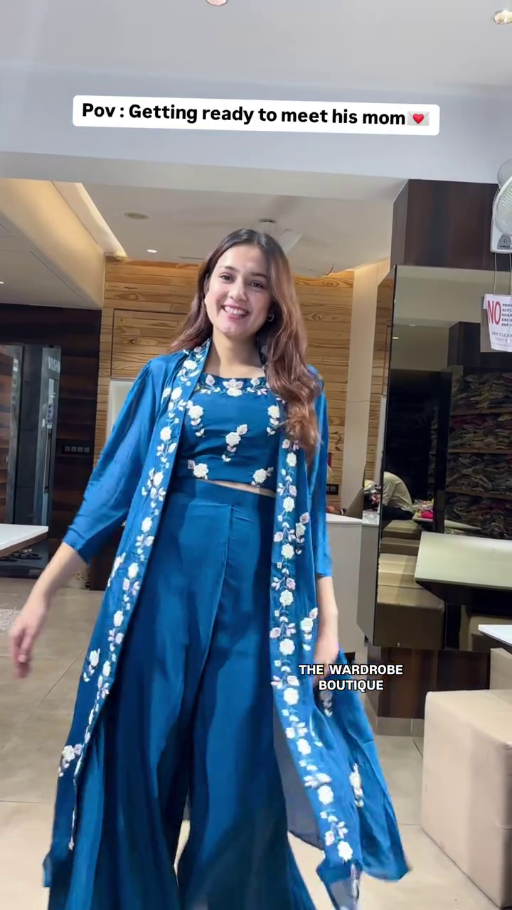 The ensemble features a beautifully coordinated 3-piece look available in two striking colors. The Ivory and Pink set features a delicate embroidered crop top and flowing ivory sharara pants paired with a vibrant pink-and-white striped (Leheriya) long jacket. The Teal Blue set offers a sophisticated look with detailed white floral embroidery on both the crop top and the edges of the matching long shrug, paired with fluid wide-leg trousers.