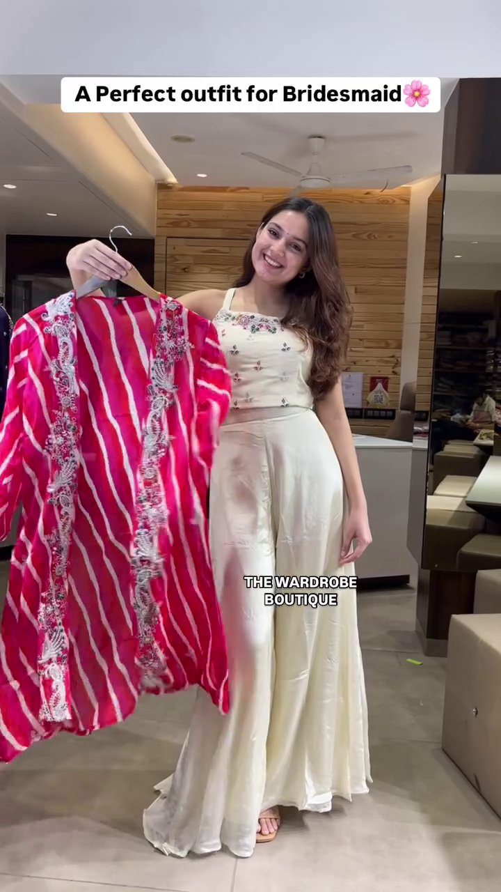 The ensemble features a soft cream-colored crop top adorned with delicate floral embroidery and shimmering sequins. It is paired with matching high-waisted sharara pants that flow gracefully as you move, creating a regal and elegant look. The highlight of the set is the vibrant pink and white striped (Leheriya) long jacket. This lightweight shrug is detailed with intricate silver border work and floral motifs along the opening, adding a pop of color and luxury to the outfit.