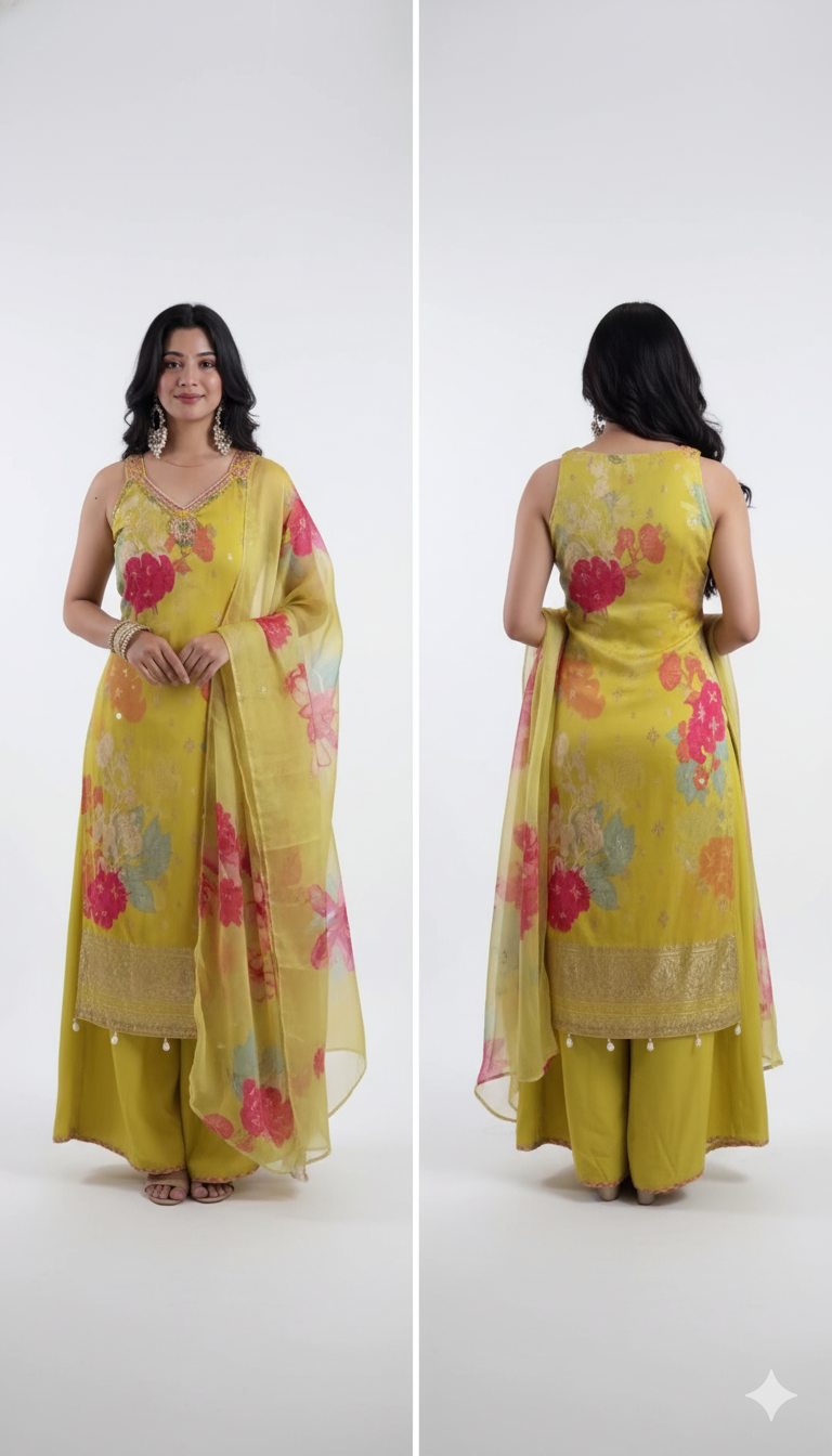 Each detail — from the delicate floral prints to the subtle sequin embellishments — has been thoughtfully chosen to create a look that’s equal parts graceful and glamorous. Whether you’re attending a festive event or simply enjoying a sunny day out, this kurta set lets you stay elegant without compromising comfort.