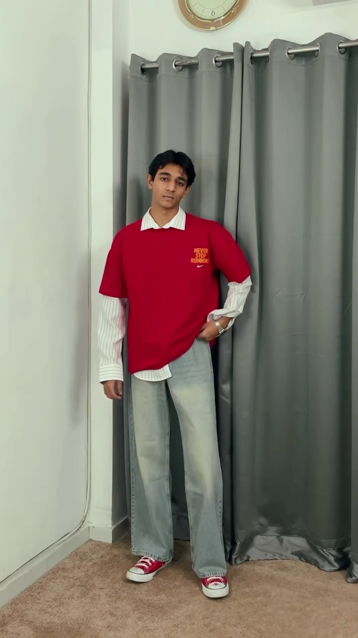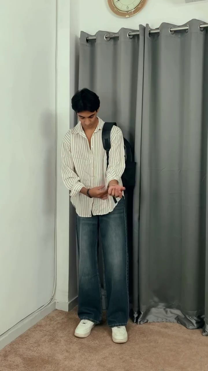 The striped shirt adds a timeless, versatile appeal with its clean lines and easygoing vibe. Whether worn buttoned up for a sharper look or styled open over a tee, it brings a touch of effortless sophistication to the outfit. Paired with baggy jeans, the look embraces a relaxed, on-trend silhouette that delivers maximum comfort and contemporary attitude.