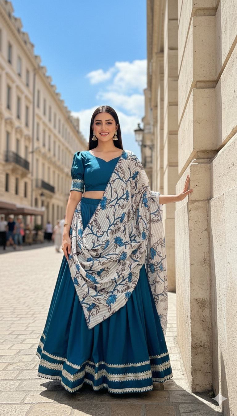 A soft, lightweight dupatta completes the ensemble, embellished with intricate borders and delicate accents that harmonize with the lehenga and choli.